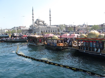 Über 400 km lang ist der Weg über die supergut ausgebaute Autobahn nach Istanbul. Sie überwindet einen waldreichen Gebirgszug bei Bolu. Sherif fährt hier im Winter Ski. Schon ca 100 km vor der Stadt geht die Fahrt am Nordufer des Marmarameers entlang durch riesige Hochhausgürtel und Industrieanlagen. Der Verkehr wird, obwohl Sonntag ist, immer dichter und vor der Brücke über den Bosporus zum Stau. Die Lage der Stadt an dieser Wasserstraße gehört zu den schönsten und ungewöhnlichsten der Welt. Wir fahren die europäische Uferstrasse entlang bis zur Galatabrücke. Dort besteigen wir ein Boot, dass den Bosporus bis hinter die zweite Autobahnbrücke befährt. Wir sehen vom Wasser aus die Fülle der Paläste und herrschaftlichen Häuser, die sich der osmanische Adel und türkische Neureiche errichtet haben. Nicht mehr weit ist es bis zum Schwarzen Meer. Die Stadt hat sich mit ihren mittlerweise 15 Mio. Einwohnern auch bis dahin ausgedehnt. 3 Mio. hatte die Stadt bei meinem ersten Besuch 1975.