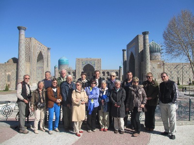 Die Reiseleiterin der Gruppe Gelb, Galina, läuft zur Hochform auf. Wir besuchen als erstes das Bauwerk, das der Reise den Namen geben hat, den Registan. Nicht die geringste Kleinigkeit, die Galina nicht erklären könnte. Das was wir in Turkestan als Torso gesehen haben, ist hier aufwendig restauriert in vollem Umfang zu sehen. Früher eine der größten Moscheen und Medressen (Koranschule) des Orients, ist es heute ein Museum. Der persische Einfluß ist nicht zu übersehen. Er manifestiert sich vor allem in der mächtigen blauen Kuppel. Später, vor allem in Isfahan, werden wir mehr davon sehen.