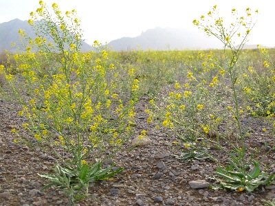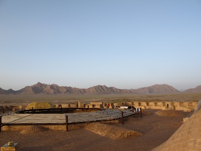 Als wir über Mittag in einem Restaurant in einer Oase in der Nähe auf iranisch halbliegend auf dem Boden sitzen, geht ein Wolkenbruch nieder. Zurück in der Karawanserei machen wir nachmittags eine lange Wanderung in die Wüste hinein. Als die Karawanserei nur noch sehr klein zu sehen ist, merken wir auf einmal, wie still es hier ist, die Autobahn ist nicht mehr zu hören. Der Regen hat die Wüste gelb werden lassen. Wildwachsender Raps ist aufgeblüht und leuchtet in der Sonne. Das Dach der Karawanserei ist begehbar , trotz der Autobahn ist die Stimmung in den Abend- und Morgenstunden überwältigend.