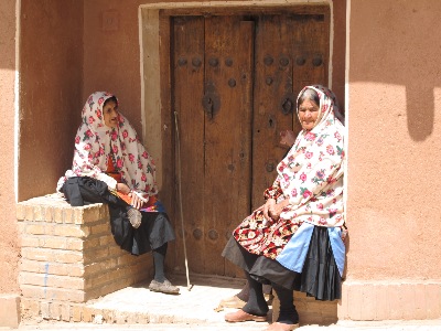 Auch die nächste Etappe ist erstmal wieder mit Diskussionen verbunden. Die Agentur hatte auf dem Weg nach Kaschan, unserem nächsten Ziel, einen Abstecher nach Abanyed vorgesehen. Auch hier hat Abdulla schlichtweg keine Lust auf einen Umweg. Andere Motive können wir nicht erkennen. Die Spritkosten können es nicht gewesen sein, ein Liter Benzin kostet weniger als 10 Cent. Wir bestehen auf dem Abstecher, allmählich kriegen wir Routine. Natürlich lohnt sich der Abstecher. Runter von der Autobahn, führt eine eher schmale Straße ins Gebirge hinein, ein Tal aufwärts voller Obstbäume. Der Ort ist eher ein großes Dorf. Die alten Häuser sind in Form und Farbe perfekt dem Gebirge angepasst. Er ist ein weiteres Zentrum der Zoroasrier. Ihr Feuertempel ist leider geschlossen, zuviel Schmiererei und Vandalismus heißt es. Wir müssen mit einer kleinen Moschee vorliebnehmen, deren Wände voll sind mit Fotos von Märtyrern aus dem Irak-Krieg. Wir laufen durch die stillen Gassen. Nur alte Leute treffen wir an, die Männer tragen rockartige weite Hosen, die Frauen bunte Kopftücher und Röcke, ungewöhnlich in diesem Land.