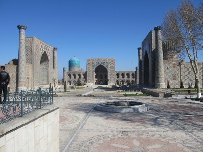 Gegen morgen steht der Zug schon eine ganze Weile auf dem pompösen Hauptbahnhof von Samarkand. Dort werden wir von drei Bläsern mit sehr lauten usbekischen Hörnern empfangen. Weniger nett ist das Verhalten der usbekischen Polizei. Die hohe Polizeipräsenz in diesem Land ist uns schon vorher aufgefallen. Ständig werden normale Reisende barsch aufgefordert, einen anderen Weg zu suchen, damit unser Empfang nicht gestört wird. Sollen wir vor den Leuten geschützt werden oder die vor uns? Den meisten von uns war das Verhalten der Polizei unangenehm, aber unternommen haben wir nichts dagegen.
