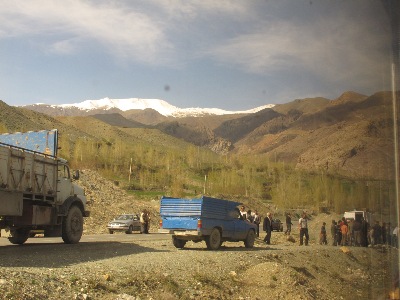 Am nächsten Morgen wartet auf uns ein Jeep, der uns mit einer turkmenischen Begleiterin an die iranische Grenze bringen soll. Die ist nur 40 km entfernt, aber schon nach 15 km müssen wir den Jeep an einer Art Vorkontrolle wieder verlassen. Er habe keine Erlaubnis bis zur Grenze zu fahren, sagt die Begleiterin. Wir müssten auf einen Shuttle-Bus umsteigen. Dieser entpuppt sich als VW-Bus, der etwa einmal alle Stunde hin-und herfährt. Vor uns warten Reisende für ca. 3 VW-Bussse . Der Begleiterin ist die Wichtigtuerei der Grenzposten peinlich. Ein Agent eines örtlichen Reisebüros wird aktiv und überredet einen Geschäftsmann, dessen übergroßes Fahrzeug viel Platz hat, uns mitzunehmen. Alles muss auf einmal sehr schnell gehen. Es geht hoch hinauf ins Gebirge, auf keinen Fall fotografieren, wurde uns eingebleut. Wir sind etwas nervös nach unseren Erfahrungen vor 5 Jahren was Grenzübergänge in Zentralasien angeht. Am eigentlichen Übergang in über 2000 m Höhe ist es immer noch recht heiß. Die Turkmenen sind pingelig, Passkontrolle, Zollkontrolle, nochn' Formular, Vorkontrolle, Hauptkontrolle, alles wird umständlich per Hand in Kladden eingetragen. Nach über einer dreiviertel Stunde dürfen wir unsere Rollrucksäcke 20 m auf die iranische Seite rollen.