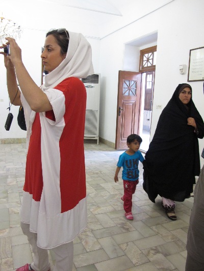 Die Hausfrau aus Teheran: Abends soll unser Zug nach Yazd fahren. Erst sagt uns Abdulla, wir könnten das Zimmer bis 20 Uhr behalten, dann müssen wir doch um 14 Uhr raus und sitzen endlos in der Hotellobby herum. Eine Frau in den 40igern spricht uns auf Englisch an. Sie hat ihr recht verständliches Englisch aus einem Buch gelernt. Sie sei eine Hausfrau, wohne in Teheran und habe zwei Söhne in den Zwanzigern, wir erwähnen, dass unsere Kinder auch in diesem Alter sind. Wir reden über Kinder, dann kommt bald die Frage Nr. 2. Wir reden ein bischen herum, erwähnen die Kopftuchpflicht. Sie sagt 'We don't like it'. Einige mehr haben es später gesagt. Sie würde uns gerne in ihr Haus einladen, aber Abdulla taucht endlich auf und will mit uns in eine weitere Sehenswürdigkeit gehen. Das Gespräch ist leider zu Ende.