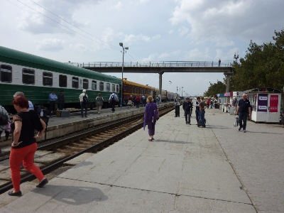Eigentlich sollte es um 16 Uhr weitergehen, aber verspätete Regelzüge auf der eingleisigen Strecke sorgen für eine Wartezeit. Es ist heute Newroz-Fest und wir haben so Zeit, das bunte Treiben zu beobachten. Die Regelzüge treffen ein, aber einer von zwei Bahnsteigen ist von unserem Sonderzug blockiert. Die Reisenden des Zuges von Taschkent nach Moskau müssen über den Schotter eines Nebengleises ihren Zug 'besteigen'. Um 17.30 Uhr geht es dann weiter.