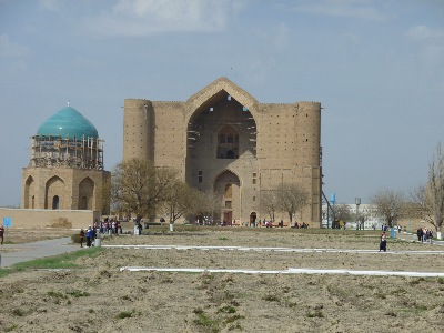 Um ca. 10 Uhr hat der Zug unser zweites und letztes kasachisches Reiseziel erreicht, die Stadt Turkestan. Die Bezeichnung diente im zaristischen Rußland als Obergriff für alle im 19. Jahrh. eroberten zentralasiatischen Gebiete. Die Stadt, heute eher überschaubar, war lange Zeit mit seiner riesigen Grabmoschee für den berühmten Sufi Jassawi einer der kulturellen Hauptorte der Region. Angeblich wiegen für gläubige Muslime 3 Besuche an diesem Ort 1 Besuch von Mekka auf. Wir sehen zum ersten Mal das Ivan genannte große Portal einer großen Moschee. Wir werden auf dieser Reise noch viele sehen.