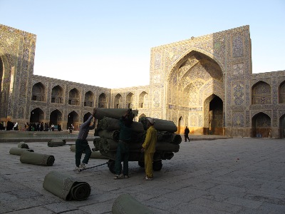 Abdulla setzt, was seine 'Reiseleiter'-Fähigkeiten angeht noch einen drauf. Das große Gebäude am Südrand des Platzes, eben jene Moschee, sei eine Schule und könne jetzt nicht besichtigt werden. Wir haben größte Zweifel, gehen hin und siehe da, dort tobt das Leben. Dort werden gerade die Gebetsteppiche für das Freitagsgebet wieder eingerollt. Abdulla übergeht seine 'Notlüge' mit der Bemerkung, na ja, das sei eben die Freitagsmoschee der Stadt. Die aber liegt laut Reiseführer 20 Fußminuten entfernt am entgegengesetzten Ende des Basars, der wiederum am Nordende des Khomeni-Platzes beginnt. Am nächsten Tag scheuchen wir ihn durch den Basar und finden die Freitagsmoschee, ebenfalls ein großer Komplex, aber am Samstagmittag eher leer. Eine Art Moscheewächter weist meine Frau an, sie müsse einen Tschador überwerfen und gibt ihr ein ziemlich dreckiges Tuch. Kurze Zeit später sagen zwei Frauen zu ihr, sie solle das Ding sofort wieder ausziehen, dass sei hier im Innenhof überhaupt nicht vorgeschrieben. Der Fetzen landet in einer Kiste.