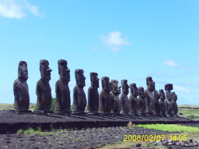Volle drei Tage Fahrt von der Robinson Crusoe Insel entfernt liegt das Traumziel der Kreuzfahrer in diesem Reiseabschnitt, die legendäre Osterinsel. Sie ist genauso berühmt wie einsam, aber die Amerikaner haben auf der mit 3000 Einwohner relativ großen Insel eine gigantische Landebahn gebaut, falls das Space Shuttle einmal unplanmäßig im Südpazifik notlanden muss. Heute landen hier hauptsächlich Touristenflugzeuge aus Chile, zu der die Insel politisch gehört. Was zieht die Leute hierher, keine Frage, die Mohais auf ihren Ahus. Die merkwürdigen, auf der Welt einzigartigen Steinskulpturen gehören zu den interessantesten Sehenswürdigkeiten meiner Reise. Sie sind so orginär, dass viele Leute die sehr teuren Flüge bezahlen um sie zu sehen. Wir werden in einem Bus geruhsam einen Tag über die Insel kutschiert, gut so, denn etwas Ruhe braucht man, um die Steinkolosse auf sich wirken zu lassen. Alle stehenden sind restauriert erst in den letzten Jahrzehnten aufgestellt worden.