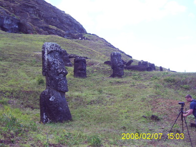Die große Masse liegt verstreut und umgestürzt über die Insel verstreut. Die Arbeiten an den Figuren wurden vor der Ankunft der ersten Europäer im 17. Jahrh. eingestellt, vermutlich wegen kriegerischer Auseinandersetzungen der verschiedenen polynesischen Stämme und Schichten, die Insel war übervölkert. Eine Skulptur ist noch Teil des Steinbruchs, aus dem alle Figuren stammen. Sie wurde nie fertiggestellt. Alle aufgestellten Figuren blicken ins Innere der Insel. Die Ahus genannten Plattformen, auf denen sie stehen, gibt es auch auf anderen Inseln, z.B. auf Huahine, wohin wir später kommen sollten. Aber die Steinkolosse gibt es nur hier.