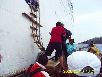 Anfang Februar ist auf Pitcairn Kreuzfahrt-Saison. Alle weltreisenden Kreuzfahrer kommen hier vorbei, bei Annäherung an die Insel wird es spannend. Auf allen Inseln, die wir angelaufen haben, außer in Tahiti, Viti Levu (Fitschi) und der Nordinsel von Neuseeland muss ausgebootet werden. Das kann auch auf der Osterinsel schwierig werden, denn dort wie auf Pitcairn gibt es keine schützenden Korallenriffe. Normalerweise geschieht das mit den eigenen Rettungsbooten über die Gangway. Nicht so auf Pitcairn. Dort machen das die Inselbewohner selbst mit den besagten Long Boats. Die Dünung ist meist so hoch, dass das Ausbooten nur über die Jakobsleiter möglich ist. Der Kreuzfahrtdirektor berichtet, dass bei 9 von 10 Anfahrten auf Pitcairn das Ausbooten nicht möglich war, die Inselbewohner kommen dann ihrerseits an Bord.