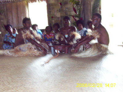 Schließlich werden wir zu einem sehr leckeren Essen in das Gemeinschaftshaus gebeten. Das Essen ist auf Matten auf dem Boden ausgebreitet. Natürlich gibt es auch Hühnchen, alles im Erdofen zubereitet. Aber vorher muss noch die obligatorische Kava Zeremonie absolviert werden. 9 mutige Männer der Gäste werden dafür gebraucht, klar war ich dabei. Kava ist die Droge des pazifischen Raums. Es gehört zu den Pfeffer-Gewächsen, wird mit Wasser gemischt zu einer weißlichen Brühe, nach deren intensivem Genuss die Zunge taub wird. Als Gast muss man "Bula" sagen, dann bekommt man mit den Worten "Bula, Bula" eine Schale Kava gereicht, die man auf einen Zug austrinken muss. Ich spüre nur einen leicht pelzigen Geschmack auf der Zunge. Das Getränk ist nicht alkoholisch, wird aber von der UNO als Droge gekennzeichnet. Nach zuviel Kava wird man sehr schläfrig. Alles in allem ein feuchter, aber wirklich lehrreicher Ausflug.