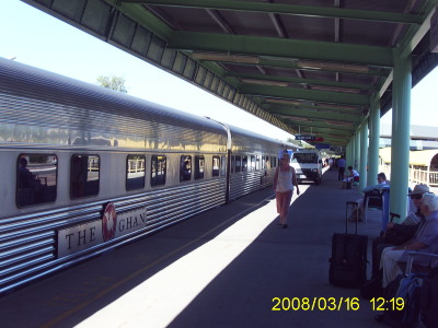 Ich reise weiter mit The Ghan nach Norden durch die Halbwüste. Der Name ist abgeleitet von Afganistan und eine Referenz an die afganischen Kamelhirten, ohne deren Hilfe das Innere von Australien nicht zu besiedeln gewesen wäre. Heute ist Australien das einzige Land mit großen freilebenden Kamelherden, man braucht sie nicht mehr. The Ghan ist ein echter Touristenzug. Die preiswerte Red Cangeroo Klasse war schon lange ausgebucht, ich musste mit der teuren Golden Cangeroo Klasse vorlieb nehmen. Überwiegend britisch sind hier die Fahrgäste. Das Essen ist vorzüglich und im üppigen Fahrpreis inklusive. Nach dem Essen geht man in die Lounge des Barwagens. Die Abteile sind eng, aber in dieser Klasse haben Alleinreisende ein Abteil für sich, im Indian Pacific mussten sich dasselbe Abteil zwei Leute teilen. Alle Betten sind sehr schmal, bei den Körperdimensionen mancher Australier hat jeder Vierte keine Chance, in ihnen bequem zu schlafen.