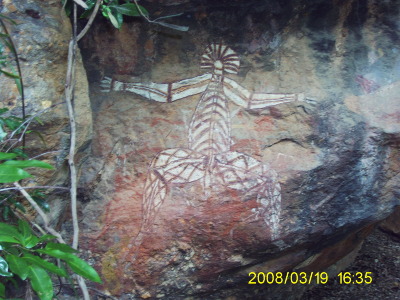 Aber in der Nähe beider Städte kann man steinzeitliche Malereien der Aborigines anschauen. Diese prägen vor allem inKatherine das Straßenbild, die meisten sitzen in Familiengruppen auf dem Mittelstreifen der Hauptstraße. Sie wirken ziemlich apathisch. Ein Aborigine erklärt uns die Lage der Ureinwohner recht eindringlich auf einem Ausflug zur Katherine Gorge. Alkoholismus und Abhängigkeit von staatlichen Leistungen kennzeichnen ihre Lage. Aber vor allem wollen sie ihre geraubten Ländereien zurück haben, ohne Aussicht auf Erfolg.