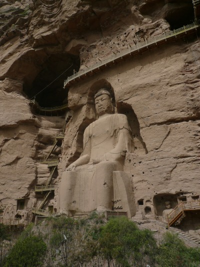 Der Besuch der Mogao-Grotten am nächsten Tag wäre fast ausgefallen, da wieder ein Sandsturm tobt. Nach einer Stunde warten wird der Besuch freigegeben. Die ursprünglich offenen Höhlen mit ihren biszu 36 m hohen Buddhastatuen sind komplett unter Verschluss. Die Türen werden nur kurz durch eine Führerin geöffnet, sie haben Taschenlampen, man kann dann kurz einen Blick auf die Statuen und die hervorragend erhaltenen Wandmalereien werfen, die auch in China einzigartig sind. Da die Führer immer aufs Tempo drücken und immer nur einen Teil der Höhlen öffnen, ist die Besichtigung keine sehr entspannte Angelegenheit ganz im Gegensatz zu unserem Besuch in Dazu und Binglisi. Den Sand- und Staubstürmen haben die Statuen und Wandmalereien ihre Vollständigkeit zu verdanken, denn sie waren zugeweht, als europäische "Entdecker" nach ihnen gesucht haben. Allerdings gab es hier auch eine sehr wertvolle Bibliothek. Sie befindet sich jetzt in Frankreich, da ein geldgieriger Mönch sie an einen Franzosen verkauft hat.