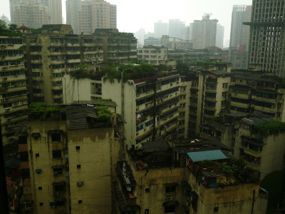 Gegen 14 Uhr geht es auf die lange Strecke nach Chongching, Zeit genug also diesen Teil Chinas bei Tageslicht zu erleben. Die Fahrt geht durch ein wenig bekanntes Gebiet, ländliches und kleinstädtisches China. Vor allem die Kleinstädte sind trostlos. Mittelhohe Hochhäuser, vergammelt und versifft, prägen das Bild. Im Zug gibt es gutes aber zu warmes Bier. Dazu essen wir Instant-Nudelsuppe zubereitet mit heißem Wasser aus dem Boiler, den jeder Waggon in China hat. In unserem Abteil ist eine Frau, die morgens Singübungen macht. Ich habe noch nie jemand so leise singen gehört. Kaum vernehmlich sieht man nur an den heftigen Bewegungen ihres Kehlkopfes, dass sie singt. Wir fahren an diesem Morgen bei trüben Wetter durch die Berge von Sichuan entlang eines Nebenflusses des Jangtse. Es ist eine Neubaustrecke mit vielen Tunneln, der Zug macht Tempo, muss aber vor Chongching lange warten.
