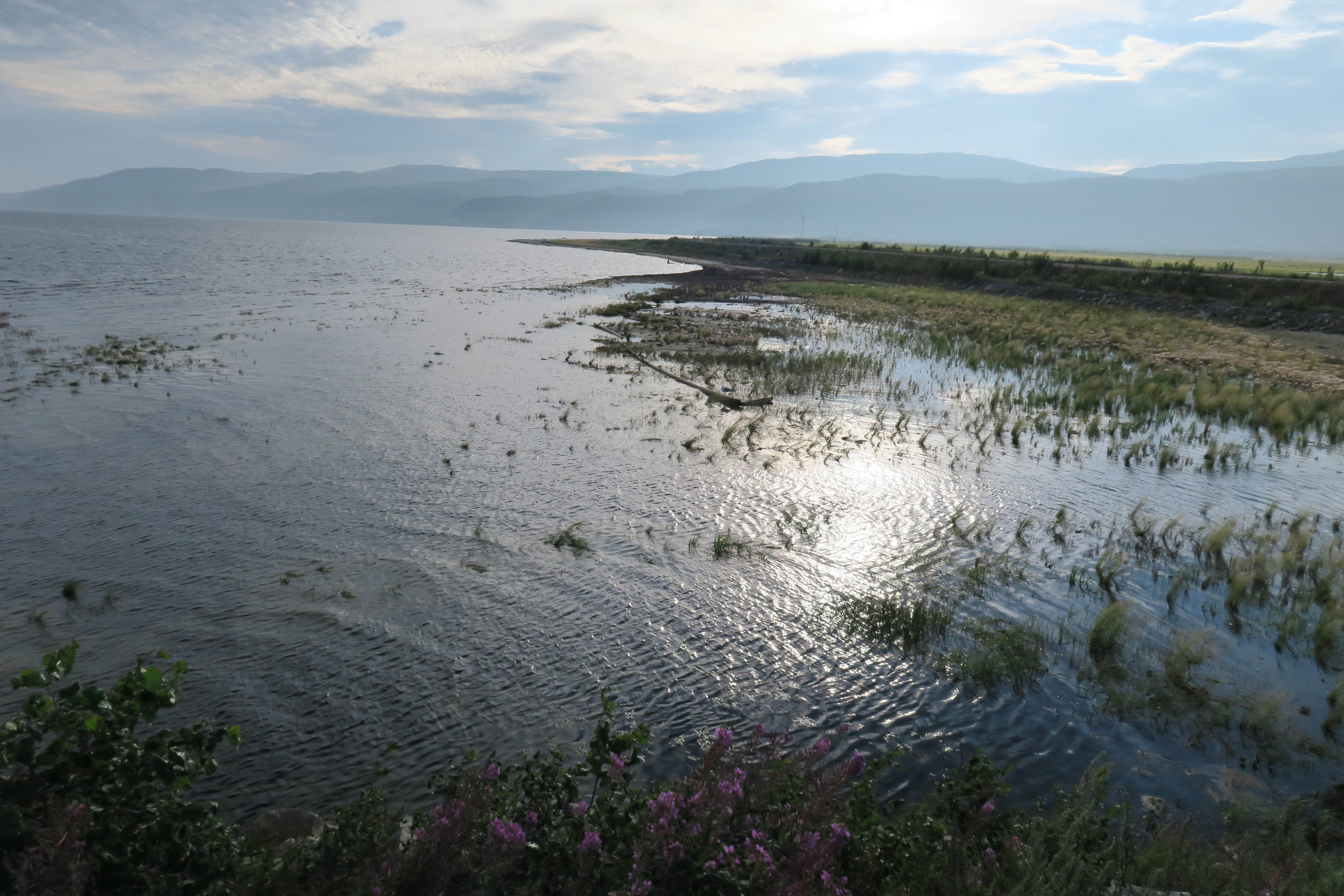 Über dem See ein paar Meter von unserem Hotel befindet sich ein Cafe-Restaurant mit außergewöhnlich guter Küche. Man kann draußen sitzen hoch über dem See. Gegen Abend ist die Stimmung einfach toll. Unten ist ein Badestrand. Ich war bei 18° Wassertemperatur drin, jawohl, das erste Bad im Baikal. Ich denke an die 11° von 2003. Der Klimawandel machts möglich.