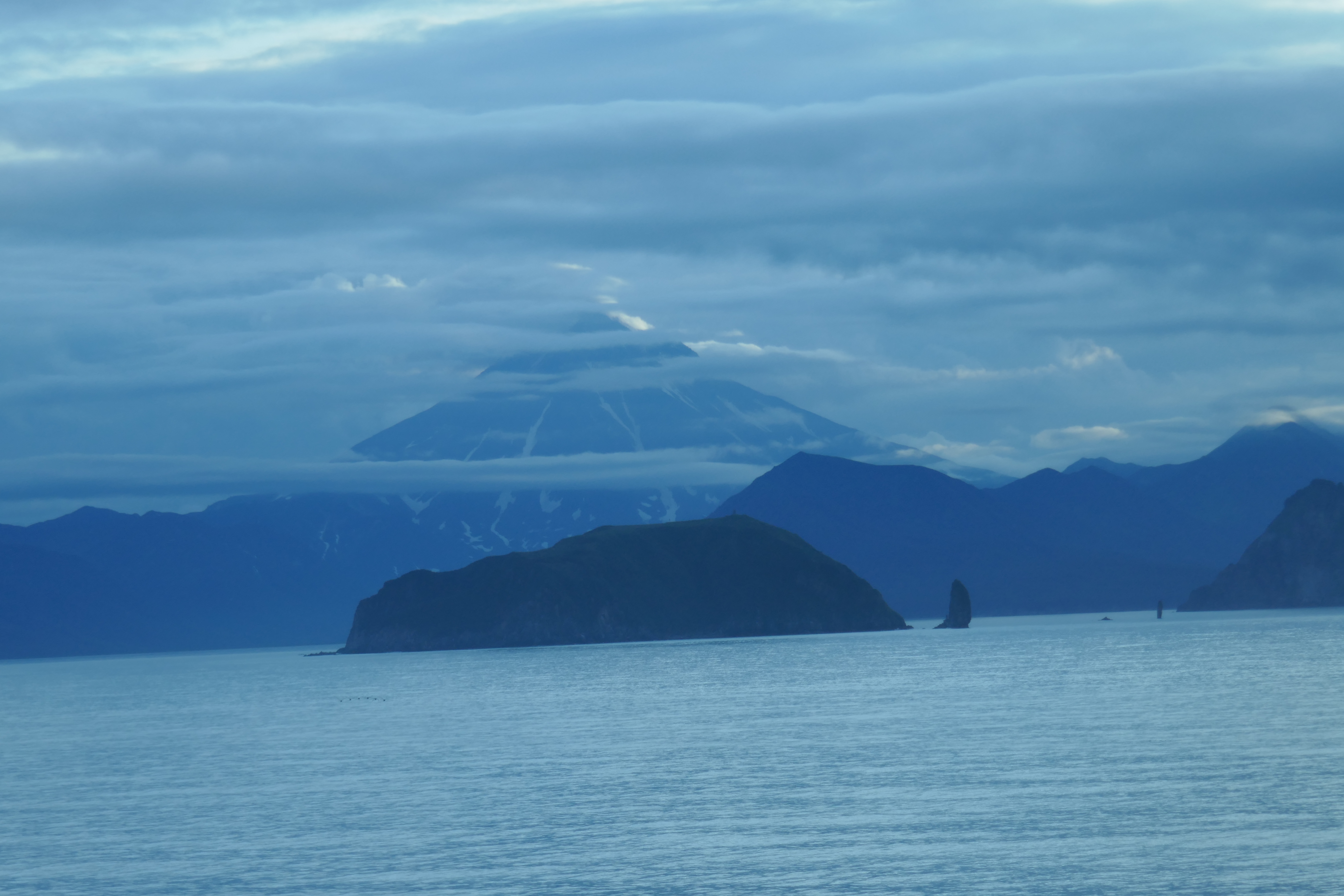 Dritter Stop des Schiffes war dann in Petropalowsk auf der russischen Halbinsel Kamtschatka. Der Versuch, vom Schiff aus einen Helikopter-Flug über die dortigen Vulkane zu organisieren, hat nicht geklappt. Wir hatten ein doppeltes russisches Visum, das wir genau dafür benötigt hätten. Wir haben es nicht gebraucht. Gesehen hätten wir nichts, dafür hingen die Wolken den ganzen Tag lang zu tief. Wir haben halt bloß eine Stadtrundfahrt gemacht. Dafür mussten wir trotzdem das Einreiseprocedere durchlaufen, obwohl das Visum nicht abgestempelt wurde. Glück haben wir dann nochmal gehabt beim Auslaufen des Schiffes in der Abenddämmerung. Es hatte aufgeklart und man konnte die drei schneebedeckten Vulkane in der Nähe der Stadt sehr gut sehen. Ein bedruckender Anblick!