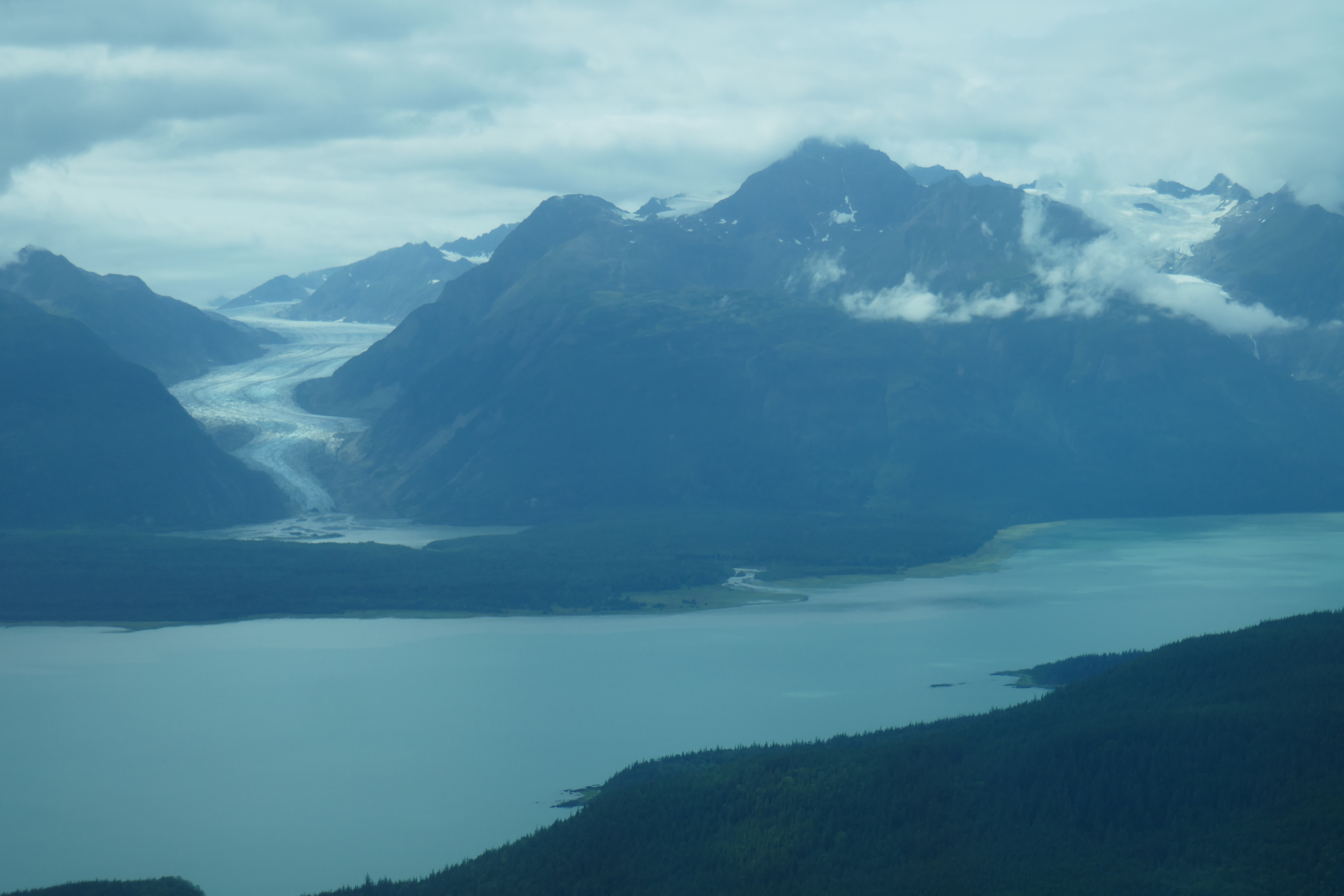 Von Skagway sind wir dann mit einer kleinen Cessna nach Juneau geflogen. Dieser Flug ca 500 m über den Fjord, der in Skagway endet hat sich wirklich gelohnt. Ich konnte neben dem Piloten sitrzen, so macht fliegen sogar einem Flugzeug-Muffel wie mir Spaß. Der Weiterflug am nächsten Tag nach Anchorage war ebenfalls interessant, da die Maschine zweimal in den gottverlassenen Orten Yakutat und Cordova zwischengelandet ist. Dadurch ist die Maschine nicht sehr hoch gestiegen und wir konnten bei ausnahmsweise bestem Wetter die beeindruckende Gletscherwelt der Coastal Range sehr gut sehen. Obwohl die Berge mit bis zu 3000 m nicht so hoch sind, wachsen die vielen Gletscher z.T. sogar. Das hängt paradoxerweise auch mit der Erderwärmung zusammen. Der Pazifik ist wärmer als früher, verdunstet also noch mehr Wasser, das sich dann unten als Regen und oben als Schnee niederschlägt.